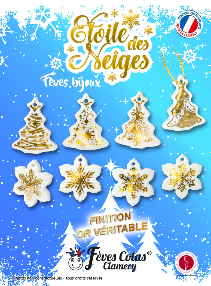 Collection de 8 fèves pendentifs en forme de flocons & sapins blancs rehaussées de fin décors à l’or véritable. De véritables fèves bijoux ……