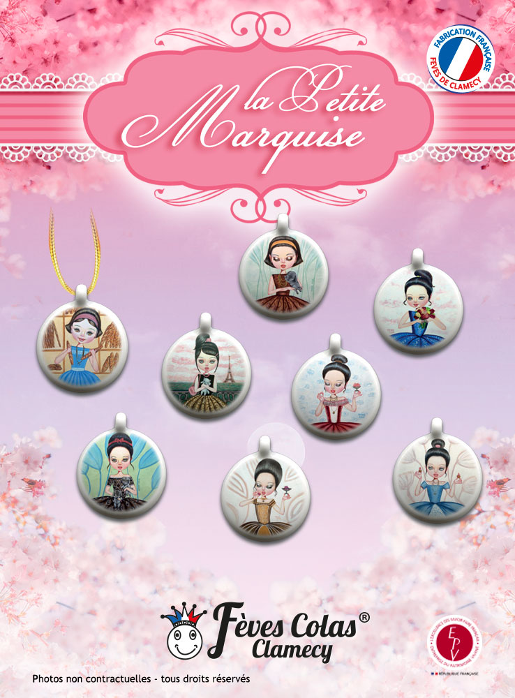 Collection de 8 fèves, en forme de pendentif rond, sur le thème de la marquise